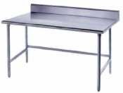 Advance Tabco 14-Gauge Stainless Steel Top - w/ Backsplash & Open Base - Model TKSS-307 Durable worktable is constructed of Type 304 stainless steel and features a 12.7cm (5") high backsplash. Tabletop has rounded front and rear edges, and the sides are turned down on a 90 degrees angle for easy alignment with other equipment. Height: ...