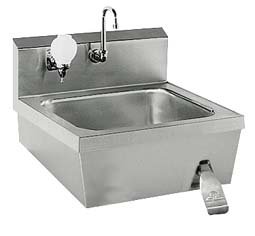SINKWALL MOUNTED 22X25 SS - Lavatory Hand Sink, Advance Tabco - Model 58400-034 - Each Features one-piece construction of heavy gauge, Type 304 stainless steel. Bowl has a deep drawn rectangular design for increased capacity. Unit is supplied with a gooseneck faucet, soap dispenser, stainless steel basket drain, and single pedal operat ...