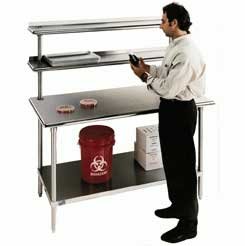 Sturdy tabletop constructed of 14-gauge, Type 304 stainless steel. The no-drip countertop is designed to contain liquid spills. Two adjustable 30.4cm (12") deep overshelves have front and side rolled rims with a rear turn-up. Adjustable undershelf is 18-gauge stainless steel. Ordering Information: Shipped unassembled.